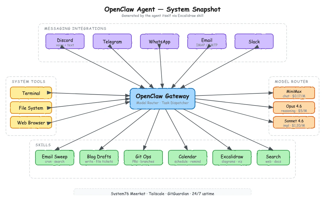 The result is a visual system map. When I asked OpenClaw to draw itself, what came back was a central "Gateway" node with spokes radiating out to each integration — Discord, email, file system, web browser — each with labeled arrows showing the protocol and data direction.