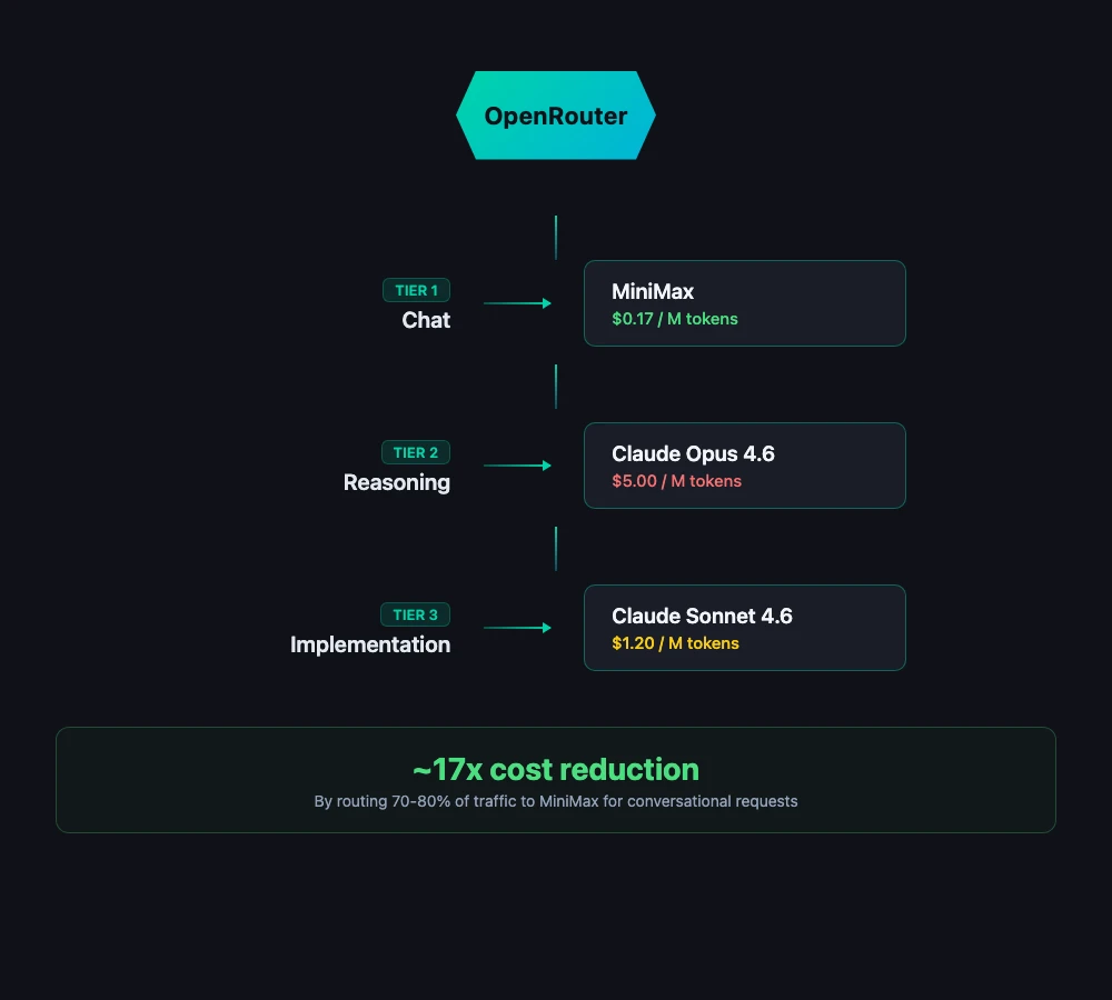 This tiered approach dropped my OpenClaw costs by 17x. Most AI interactions don't need frontier-level reasoning — they need a fast, capable model that can handle conversational flow, tool use, and general coding. M2.5 fills that role better than anything else I've tested at its price point.