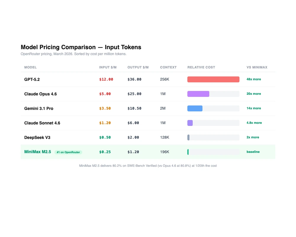 The pricing reflects this. On OpenRouter, M2.5 comes in two variants. The standard model costs ~$0.20 per million input tokens and $1.20 per million output tokens at 50 tokens/second. M2.5-Lightning doubles the speed to 100 tokens/second for roughly $0.30/$2.40."For comparison, Claude Opus 4.6 runs $5 per million input tokens. That makes M2.5 roughly 95% cheaper than Opus for equivalent tasks. VentureBeat called it "near state-of-the-art while costing 1/20th of Claude Opus 4.6," and that tracks with what I've seen.
