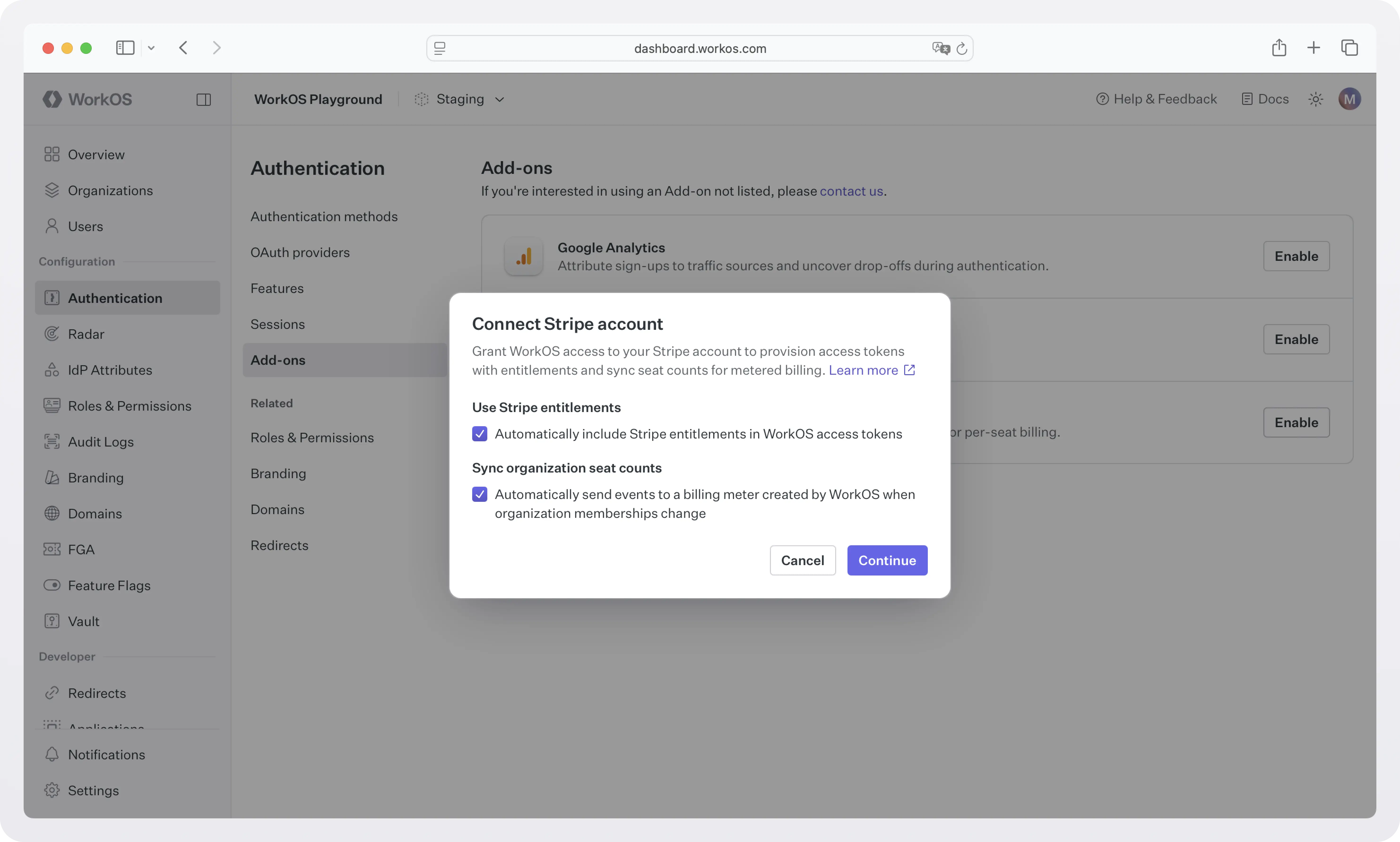 Go to WorkOS Dashboard > Authentication> Add-ons and select Enable. Check the “Sync organization seat counts” option and click Continue.