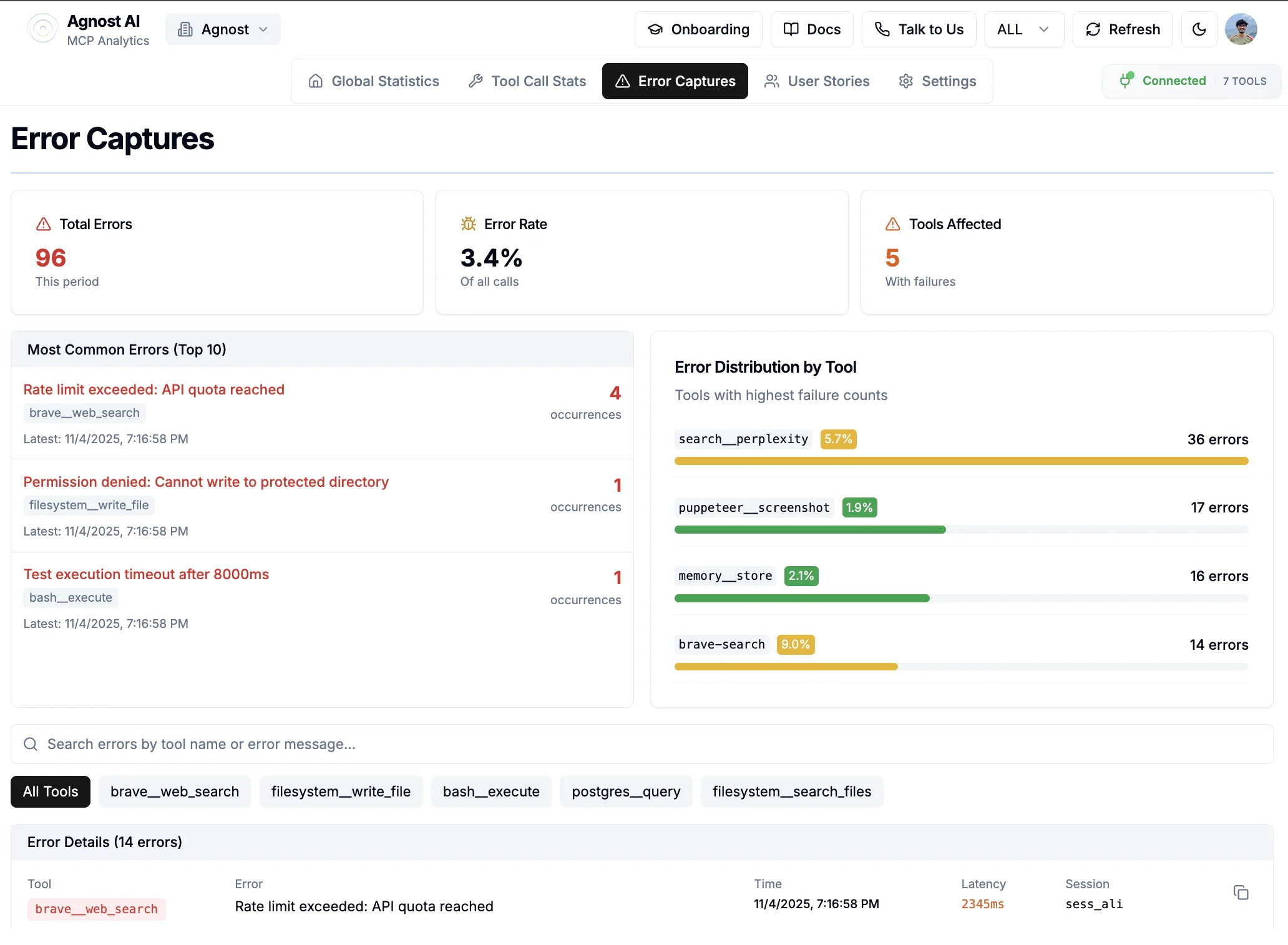 Tool invocations happen asynchronously, user journeys span multiple sessions across different AI clients, and errors can be buried in LLM context windows. Agnost provides purpose-built observability for these patterns.